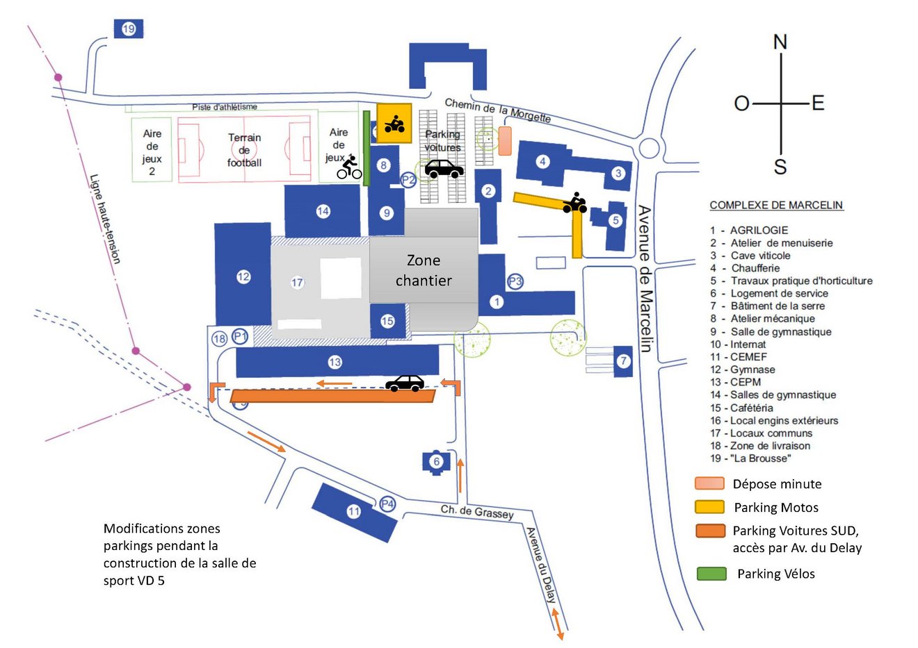 Ci-dessous, vous trouverez un plan avec les zones de parcage disponibles pendant les travaux (pour rappel, le parking des voitures est interdit aux élèves et les contrôles sont journaliers).